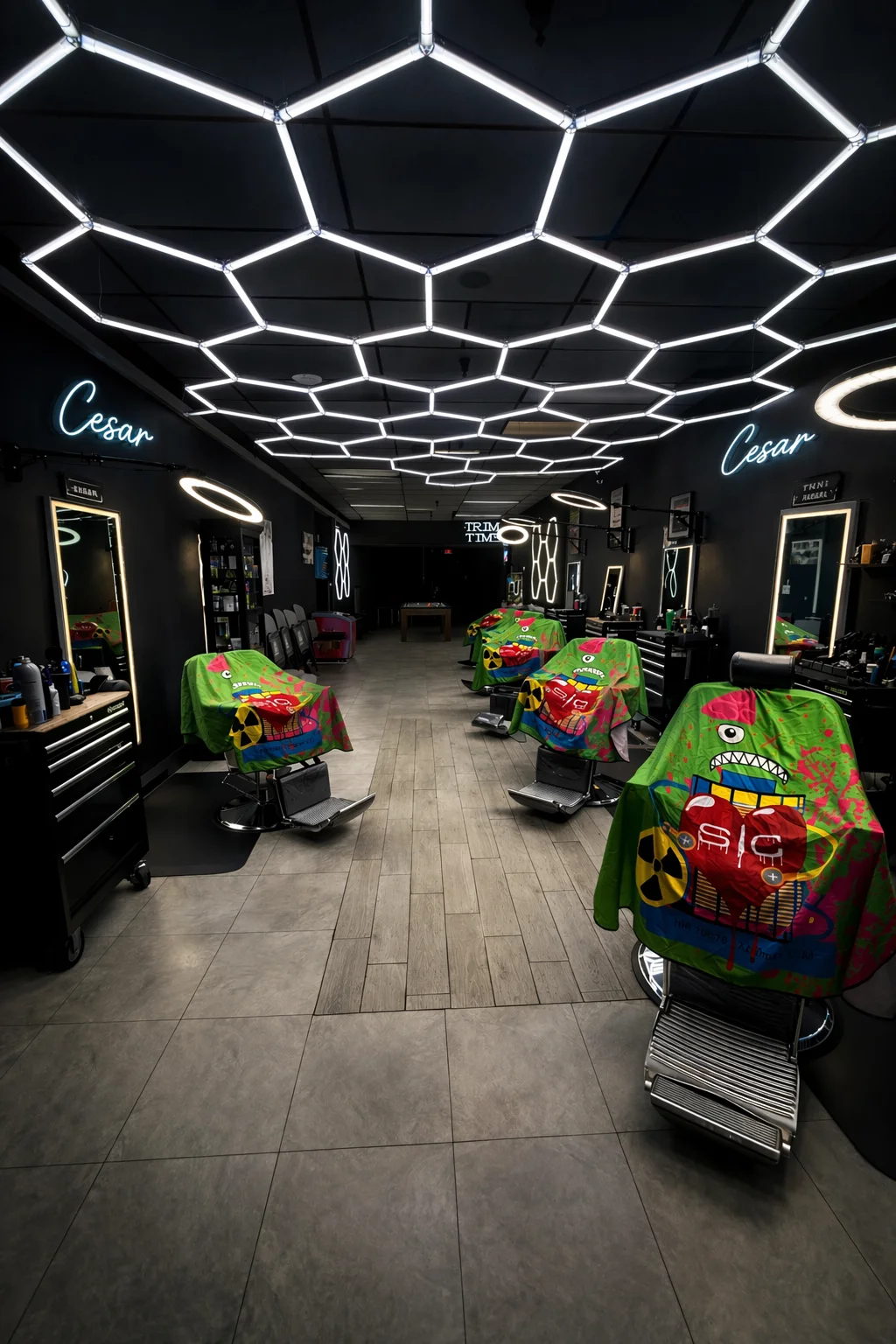 Trim Time runs six days a week out of a small shop on US-301, three miles north of the river. Hexagonal LEDs on the ceiling, black chairs under a warm mirror, a neon sign that says what the shop says. No frills, no upsells, no theatre. Just a chair and the work that happens in it.